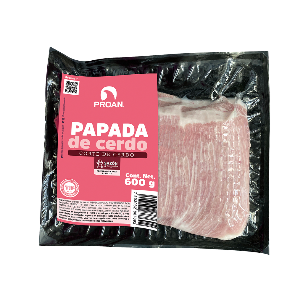 La papada de cerdo Proan se obtiene del cuarto delantero del cerdo y se prepara cuidadosamente para eliminar el exceso de grasa, dejando una fina capa exterior y la parte interna hasta el nivel del músculo. Esta carne jugosa y tierna ofrece un sabor inigualable y es perfecta para asar a la parrilla o cocinar lentamente. Cada pieza está seleccionada para garantizar la más alta calidad y frescura, y se empaca de manera individual.