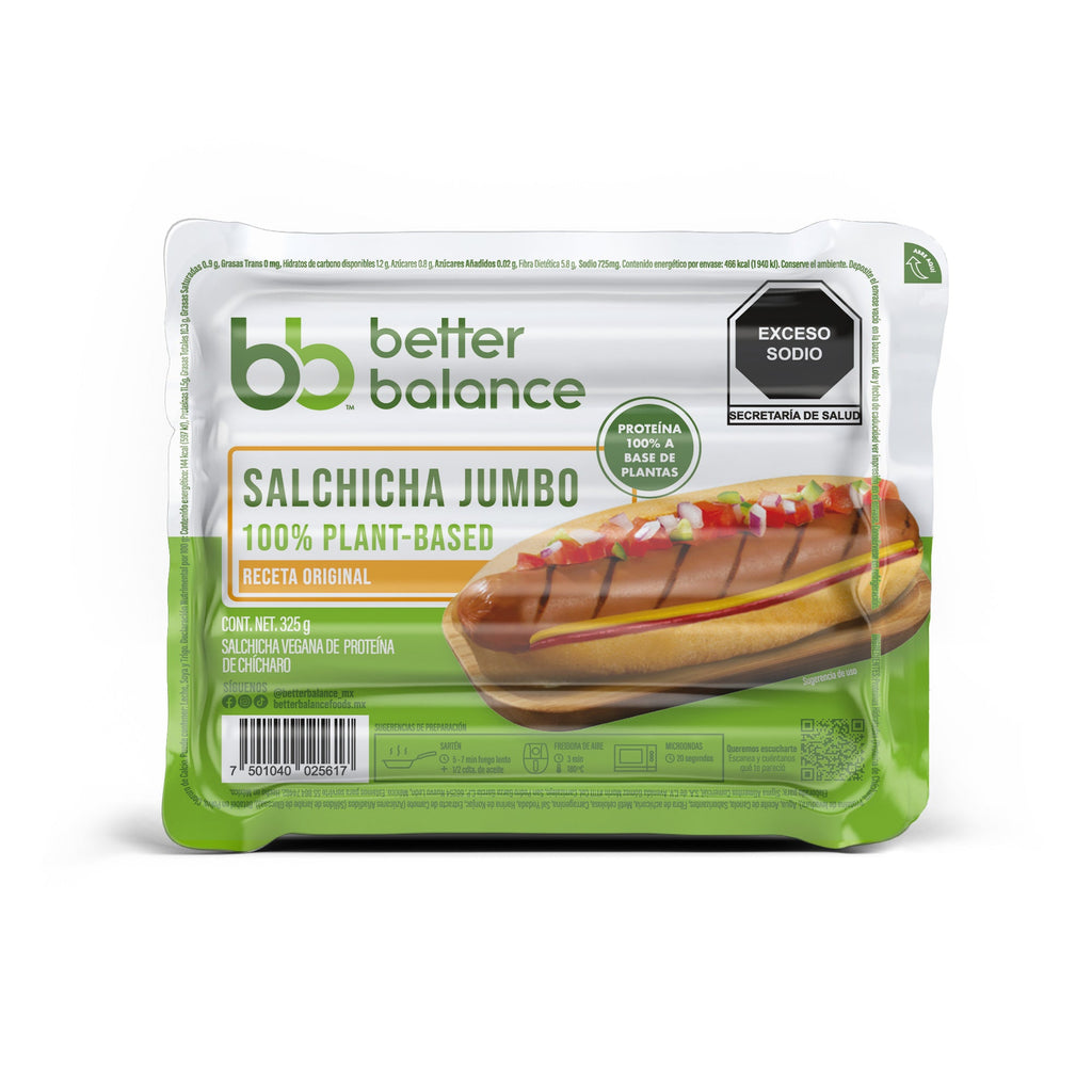 Nueva Salchicha 100% a base de plantas Better Balance con un excelente sabor! Hecha con proteína de chícharo; no contiene colesterol, gluten o conservadores. Además, es alto en proteína. Prepárala al sartén, Freidora de aire, microondas o en frío! En presentación de 325g con 5 salchichas jumbo, ideal para Hot Dog.